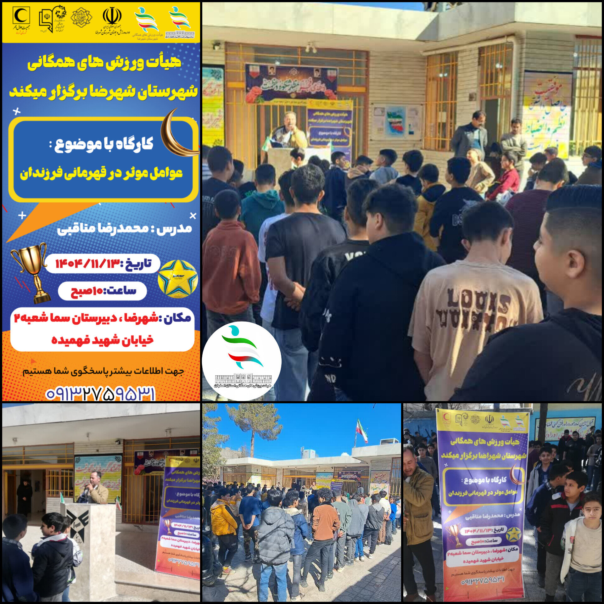 این کارگاه با حضور دانشآموزان دبیرستان پسرانه سما و با تدریس محمدرضا مناقبی، رئیس هیئت ورزشهای همگانی شهرضا، انجام شد. در این برنامه آموزشی، ابعاد مختلف سلامت جسمی و روانی و نقش آن در دستیابی به موفقیتهای ورزشی و قهرمانی مورد بررسی قرار گرفت.